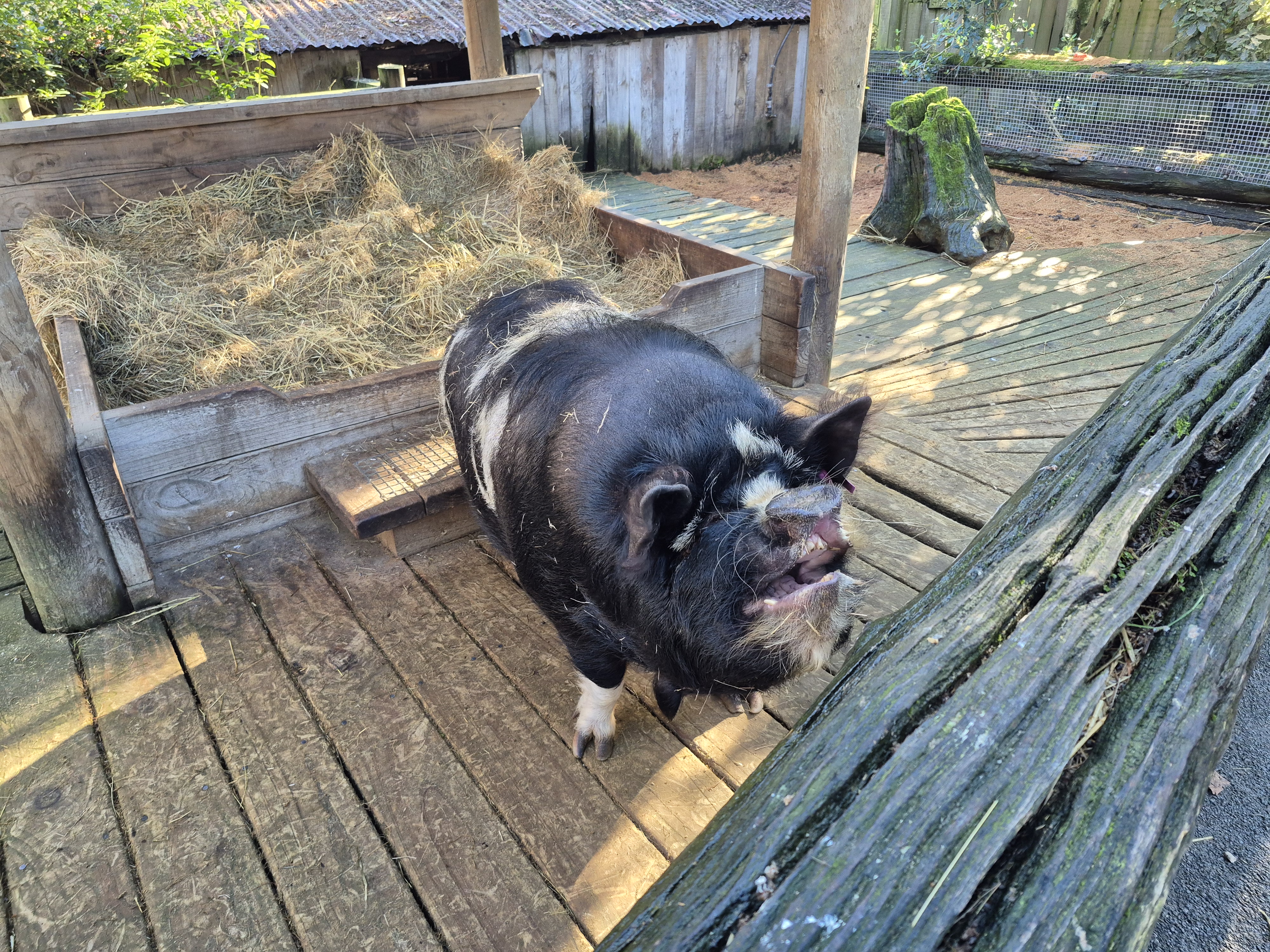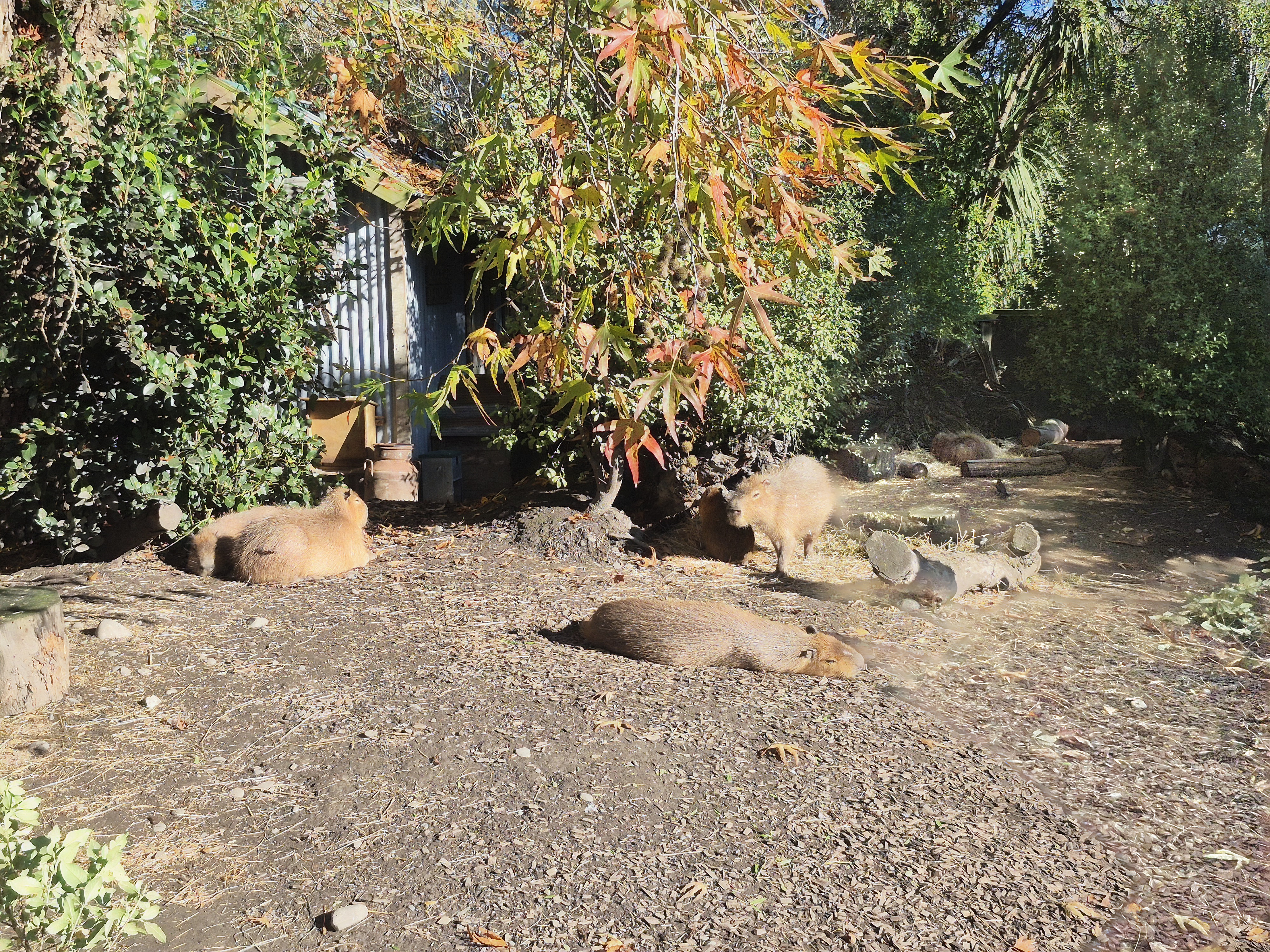 From left to right: Auckland Island Pig, alpaca, and capybaras laying in the sun 🙂