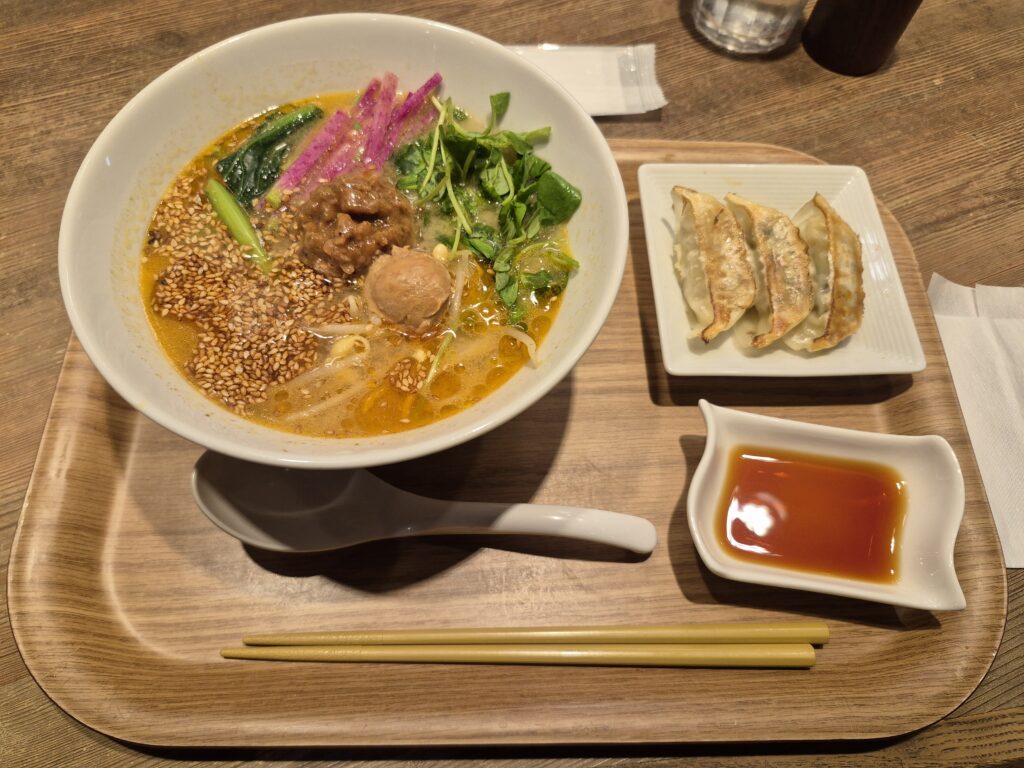 I ordered their White Sesame TanTan Ramen with soy meat and gyoza dumplings. So good! 😛
