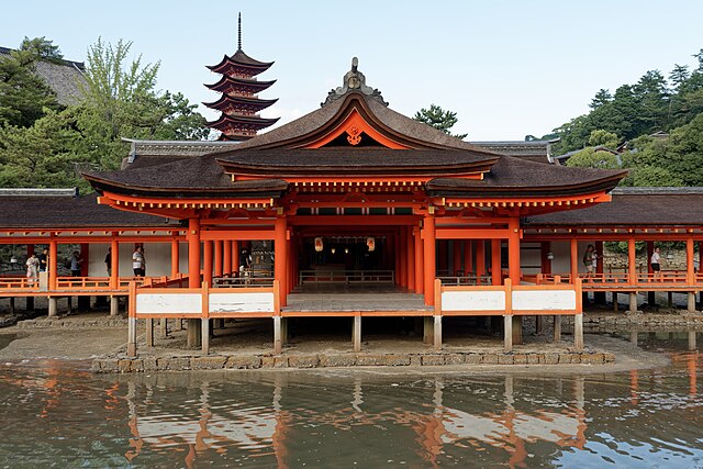 Itsukushima Shrine has several buildings, like a prayer hall, treasure hall, main hall, and Noh Theater stage. They are linked by boardwalks and supported by pillars above the sea.
